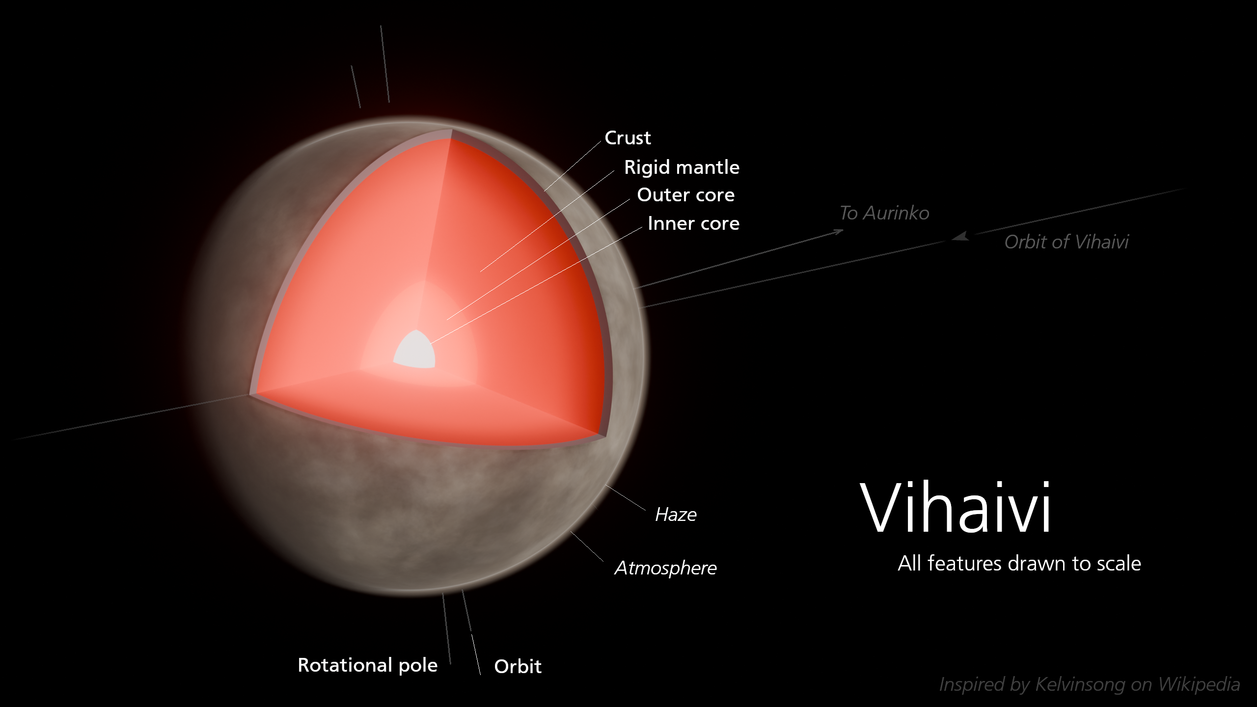 Vihaivi is a volcanic moon of Kaveri and orbits about 37,500 km away from it. Due to its close proximity, it experiences large amounts of tidal heating, keeping its internals liquid, fuelling its volcanism. It has a radius of about 3,200 km and mass 1.17 times that of Earth's moon.